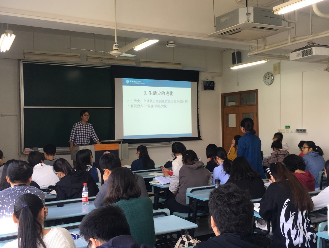课堂上,汪承焕老师首先回顾了上一节课程的概要和内容,并对生命表的基本参数进行阐述。结合生活中的例子---地中海角豆树的种子质量(克拉的由来)来激起同学们的学习兴趣,以生活史的进化主题,分别从繁殖年龄、种子大小、种子产量、种子散布等章节进行深入和探讨,最大种子复椰子树的举例更引得学生的惊叹和好奇。当同学们意犹未尽之时,随着下课铃声的想起,本次《植物生态学》公开课暂时告一段落。