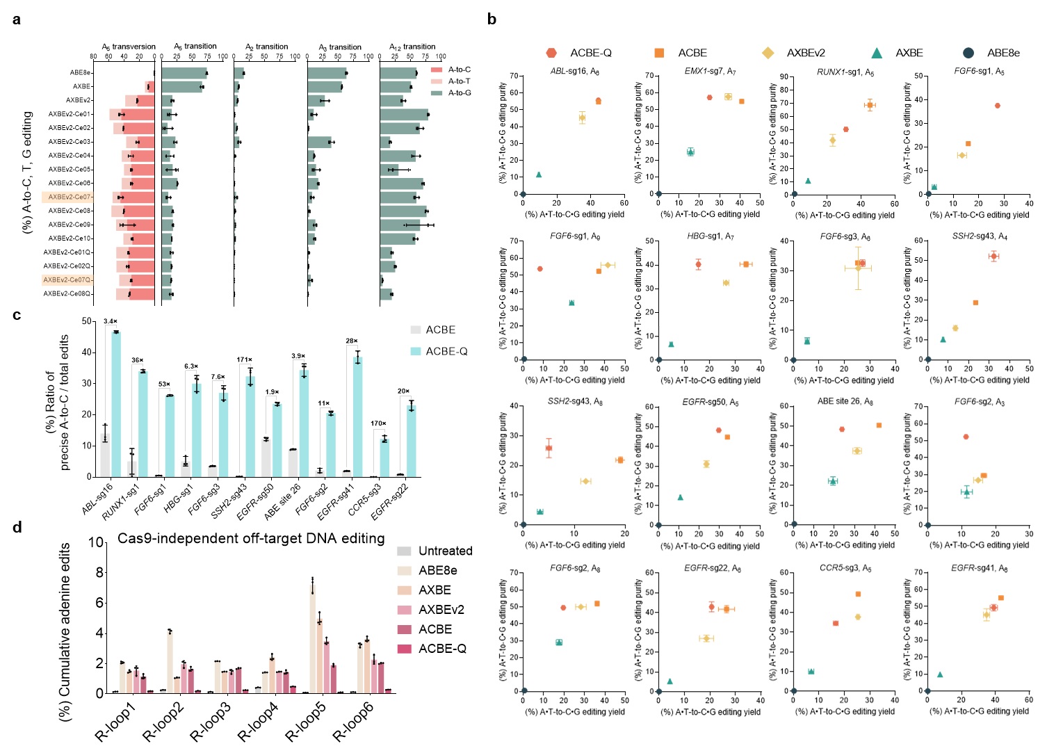 虽然AXBEv2展现了高效的A到Y编辑能力(C为主要产物),但也诱导了严重的非目标碱基A到G突变,于是研究人员希望通过缩窄编辑窗口减少不想要的编辑副产物。腺嘌呤脱氨酶的改造及Cas9嵌入策略的尝试使得A到G的编辑副产物大幅降低,并且A到C的编辑效率还进一步提高,因此该类型编辑器被命名为ACBEs。其中ACBE版本最高可实现45%的A到C编辑以及73%的碱基颠换编辑,而ACBE-Q版本(TadA-8e中引入N108Q突变)相较于ACBE,进一步显著减少了旁观者A到G突变,更加精准地编辑sgRNA的A4-A6位,精确度最高提高了171倍,且只产生背景水平的Cas9非依赖性脱靶事件(平均脱靶效率<0.3%),展现出较高的应用安全性。