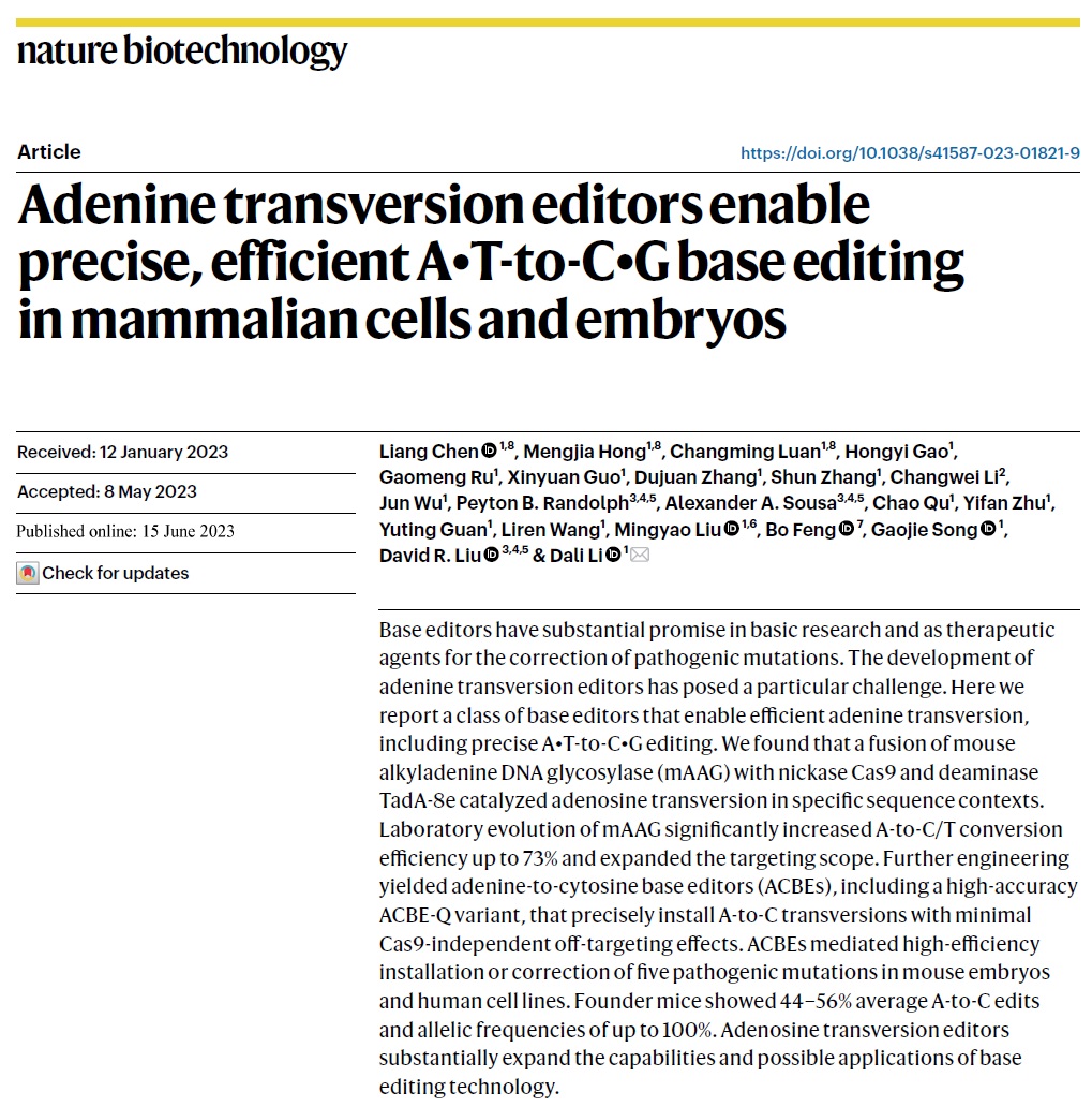 暗网视频 李大力教授团队继2022年10月在国际著名学术期刊 Nature Chemical Biology 报道新一代精准安全的腺嘌呤碱基编辑器ABE9以及11月在国际著名学术期刊 Nature Biotechnology 报道高精度新型胞嘧啶碱基编辑系统Td-BEs后,一年不到又迎来新的技术突破,2023年6月15日该团队再次在 Nature Biotechnology 上发表了题为“Adenine transversion editors enable precise, efficient A•T-to-C•G base editing in mammalian cells and embryos”的研究论文。